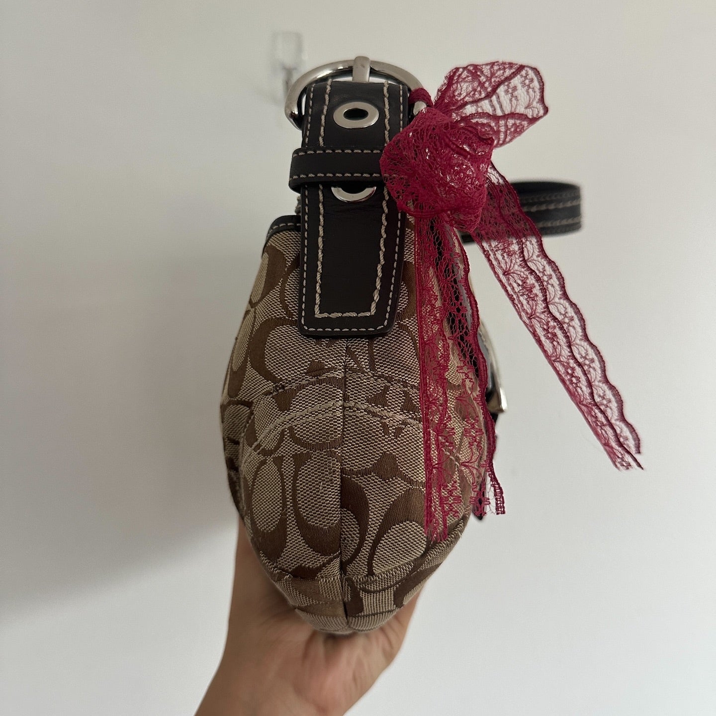 Y2K Coach brown monogram big Soho bag, featuring a spacious design and classic monogram pattern. In great overall condition with some minimal tears to the canvas, adding a vintage charm to this timeless accessory.