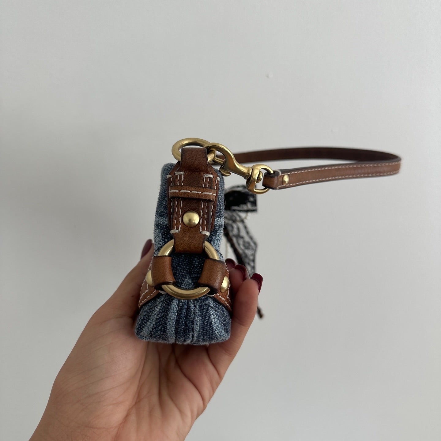 Iconic Y2K Coach denim mini bag featuring the classic monogram design and leather accents. Its compact size and timeless style make it the perfect accessory for adding early 2000s nostalgia to any outfit.